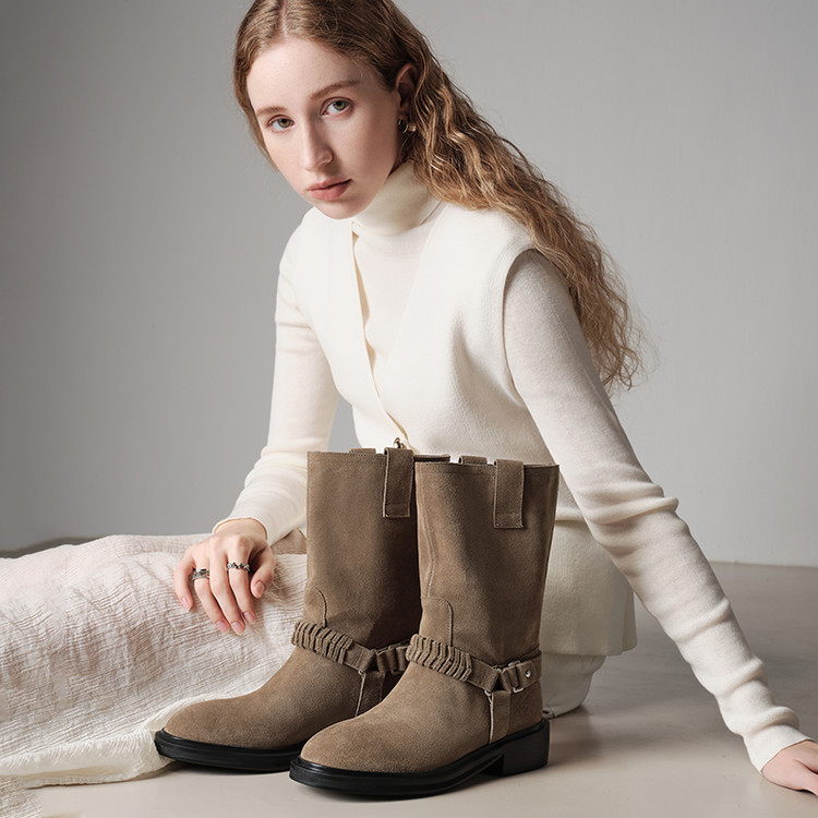 内增高 尖头 高筒靴 头层牛翻皮