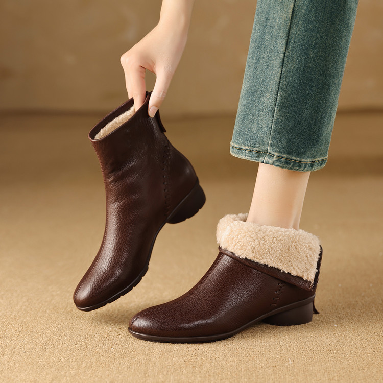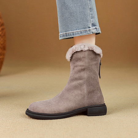2025冬季新款毛鞋圆头粗低跟后拉链短靴雪地靴