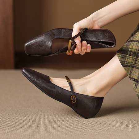 法式复古水洗擦色编织粗跟中跟单鞋~现货
