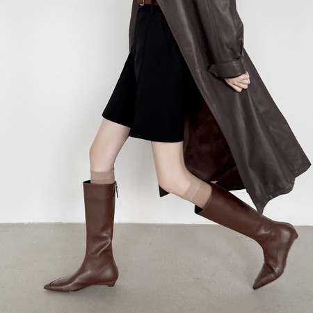 欧美风时尚尖头粗跟单鞋女平跟绒面金属铁头浅口一脚蹬女鞋